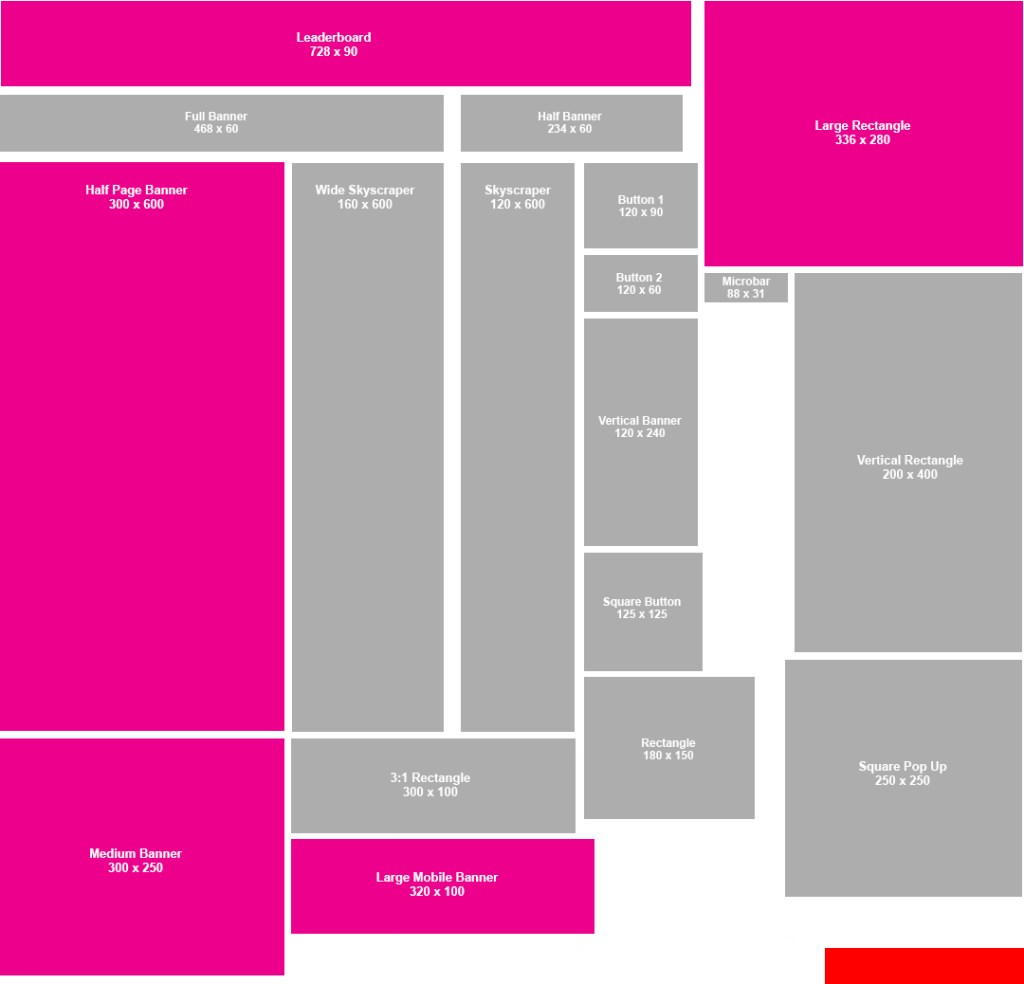 Mai jos sunt dimensiunile standard de bannere web pe care le poți implemeta pe orice site web. Cele care sunt evidențiate sunt considerate primele dintre cele 5 cele mai eficiente dimensiuni de bannere web conform Google.