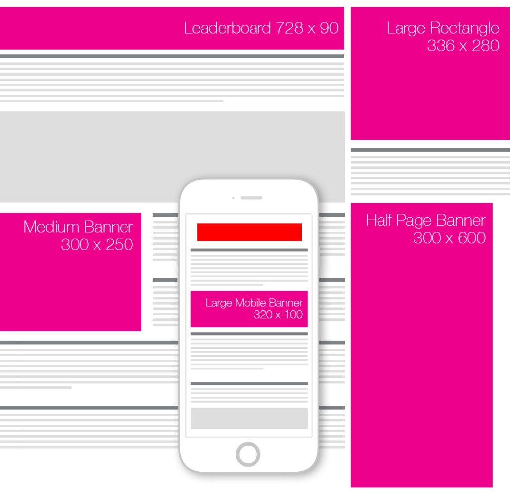 Exemplu de machetă a primelor 5 cele mai eficiente dimensiuni de bannere web pe o pagină web